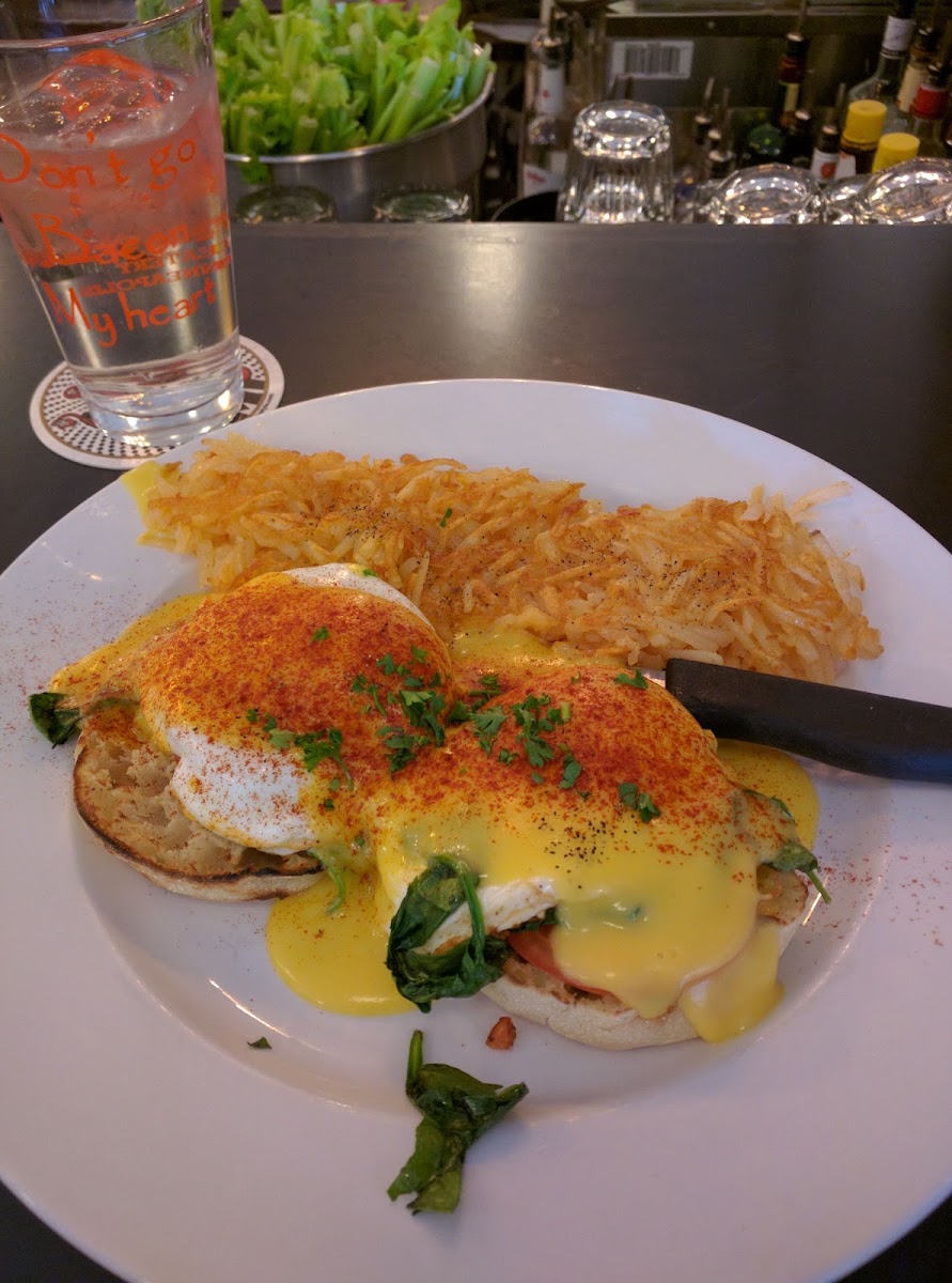 I came around 10 on Sunday morning and it happened to be a game day. Holy cow this place was packed!! I was not prepared for the amount of folks waiting outside. Luckily I was a solo dinner and got a seat right away at the bar. The server recommended Babe's Eggs Benedict (jalapeño cheddar cornbread, pork carn vith cajun hollandaise and hash browns) so that what I went with plus fresh OJ. When I got my meal he set down a bottle of local hot sauce and said it paired great with the dish. IT WAS AMAZING!! Probably the best eggs Benedict of my entire life… it was sweet, savory and spicy and hit all the taste bud receptors! The fresh OJ was also phenomenal. By the time I finished the line for a table had gone down considerably, so seems like they are really good a getting folks through quickly! 10/10!!